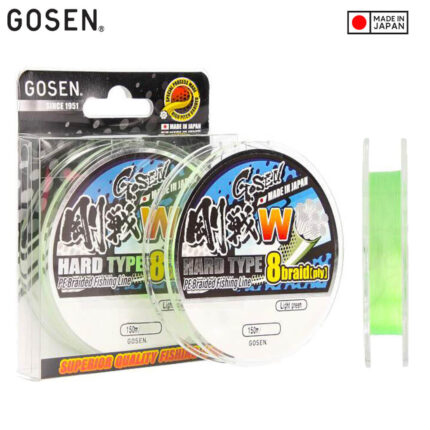 GOSEN PE W Hard Type 8 este un fir textil impletit in 8 cu absorbtie scazuta de apa si rezistenta mare la nod. Este putin mai ridig dar suplu si usor de lansat. Impletitura stransa a acestui model reduce la minimum absorbtia de apa si, in acelasi timp, asigura lansari lungi, precise, precum si o susceptibilitate redusa smenificativ la vant. Datorita ratei de scufundare relativ mare a firului, recomandam acest model de culoare verde deschis, foarte vizibil, in primul rand pentru pescuitul cu naluci soft la jig sau alte monturi.