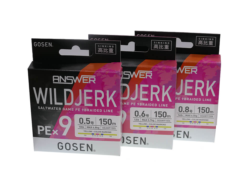 Firul textil Gosen ANSWER WILDJERK PE x 9 Sinking reprezinta evolutia gamei Wild Jerk si este proiectat specific pentru pescuitul la Eging (calamar si sepie) si a fost de catre cel mai faimos si respectat pescar de cefalopode din Japonia, Nobutori Shigemi. Cea mai mare caracteristica a firului este ca foloseste o linie PE de inalta densitate. Comparativ cu firele PE obisnuite, acesta se scufunda mai usor in apa si este mai putin afectat de valuri si vant, oferind o operabilitate stabila si o sensibilitate ridicata. Firul este rezistent la vant, considerat un punct slab in tehnica Eging, si poate fi utilizat confortabil chiar si in conditii adverse. Designul firului a evoluat: constructia din 8 suvite PE plus un miez de fibra de inalta densitate (high-density fiber core) reduce frictiunea, crescand distanta de lansare. Aceasta tehnologie de fabricatie speciala ii confera firului o greutate specifica optimizata, permitandu-i sa penetreze apa si sa fie mai putin afectat de vantul puternic si de valuri. Rezultatul este o manevrabilitate si sensibilitate superioare. In plus, impletitura din 8 suvite contribuie la o suprafata neteda si rotunda, care imbunatateste distanta de lansare si reduce frecarea. In plus, firul beneficiaza de tratamentul unic Gosen, “SG Processing”, care imbunatateste hidrofobia (respingerea apei) si adauga o rigiditate si o fermitate moderate. Aceste caracteristici maresc semnificativ manevrabilitatea si sensibilitatea. Firul utilizeaza noua schema de culori “BCM (Bite Catch Marking System)”. Culoarea, dezvoltata in urma a numeroase teste si care pastreaza baza traditionala galbena, face posibila detectarea vizuala chiar si a celor mai delicate muscaturi.
