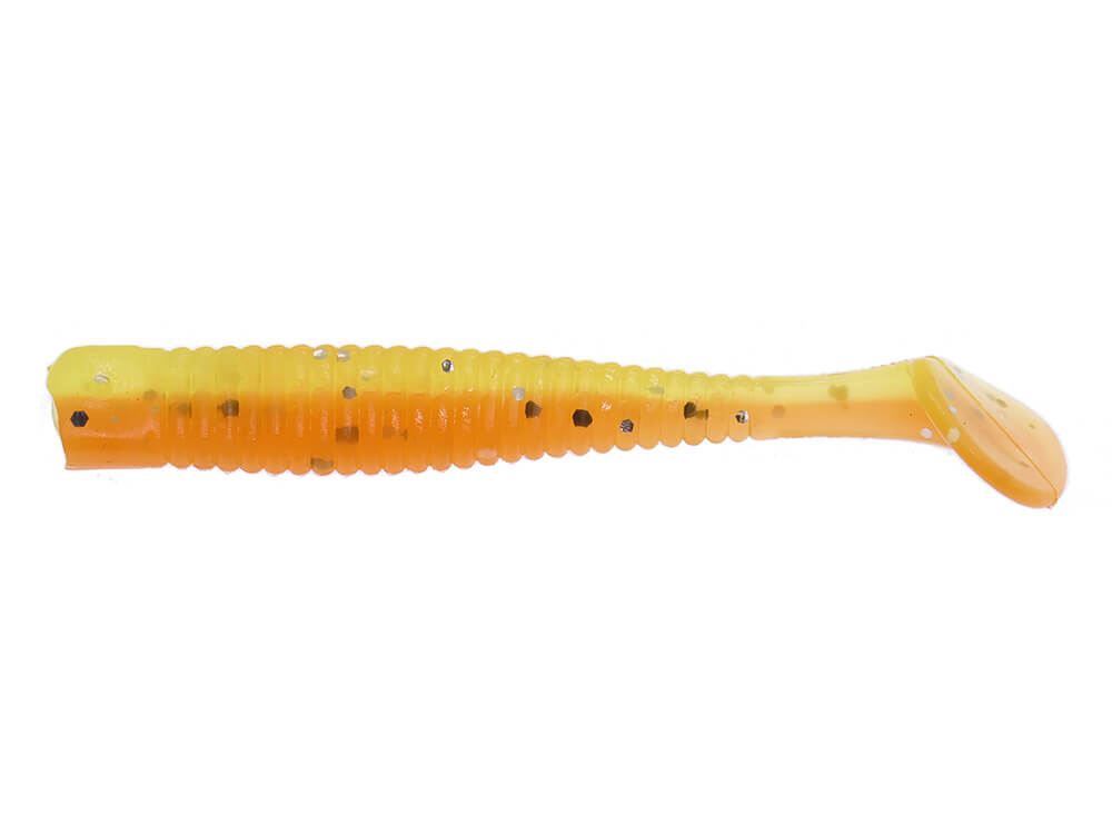 Soft bait HITFISH Skimy is available in sizes 2.5 and 3.5 inches.The soft bait HitFish Skimpy has a kind of flexible and moving body. This bait is ideal for catching perch on drop-shot. In form Skimpy recalls the natural food – a small fish. Also for this bait are characteristic active realistic movements due to the movable tail and ribbed surface. A special attractant with a natural taste and smell strengthens the resemblance to the usual prey of predatory fish. Active movements, a secreted smell plus a realistic shape will provoke even the most cautious predator to bite. HitFish Skimpy is available in sizes of 6.3 cm and 8.9 cm. A wide range of these baits allows you to choose the right color: from shades of green to a bright orange color that will be noticeable in muddy water. Such a bait will not go unnoticed due to its shape, movements, smell and sparkles, which will further intrigue a curious predator.