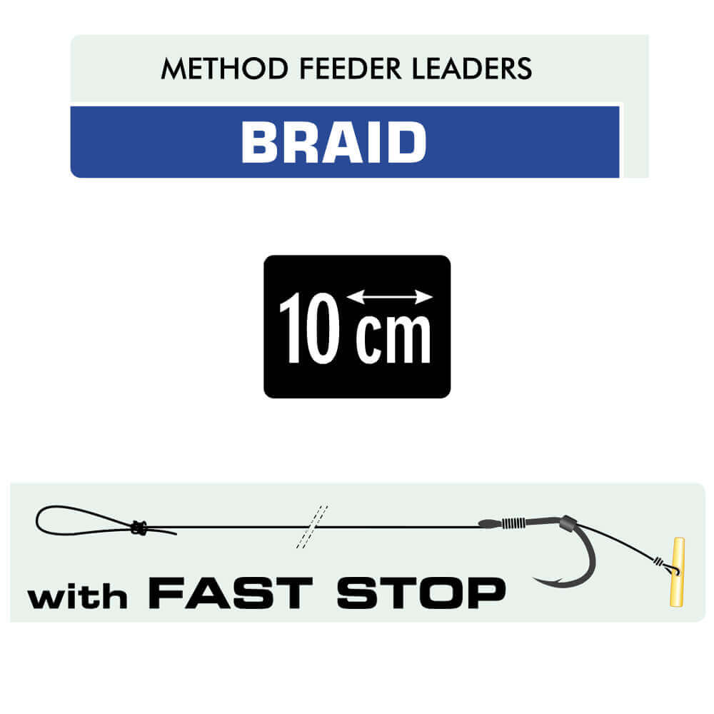 Forfacuri prelegate cu fir textil 10cm si opitor rapid (Fast Stop) realizate pe carlige Kamatsu Sensei (debarbetate), ideale pentru monturile method feeder. Materialul rigid si rezistent nu deterioreaza firul de par si fixeaza ferm momeala de carlig. Este destinata în special pentru fanii tehnicii de pescuit prin feeder care pescuiesc cu momeli mai mici: pelete, wafters, boabe de porumb, cubulete de mamaliga, pop up-ur. Practic, aceste forface va scutesc de corvoada legarii firului de par pe carlige mici si va ajuta sa petreceti pescuind, un timp indelungat pentru pescuit pe malul apei. Capatul forfacului este o bucla pe care o fixam rapid in conectorul de la baza momitorului method. Materialele folosite in aceasta montura sunt fabricate in Korea.