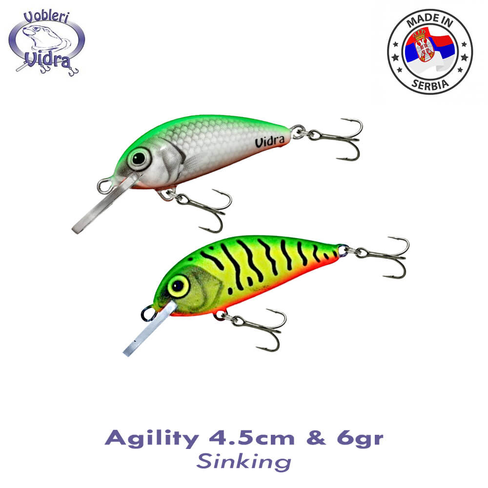 Modelul Agility este proiectat pentru pescuitul pe ape mici, medii sau mari dupa avat, pastrav, clean si chiar mreana. Prinderea somnilor sau a salailor pe aceste naluca nu este, de asemenea, o surpriza. In apele statatoare, bibanul nu ii poate rezista, mai ales de-a lungul malului sau ierbii acvatice. Este caracterizat prin vibratii mici si stabilitate exceptionala, chiar si in ape cu un curent foarte rapid. Agility 45S este o naluca foarte energica, cu un joc realist, are un corp intarit cu bile metalice incorporate, care emit un sunt provocator sub apa, care innebuneste pestii rapitori. Voblerul are o gama larga de acoperire a straturilor de apa de la 0.3 pana la 2m.